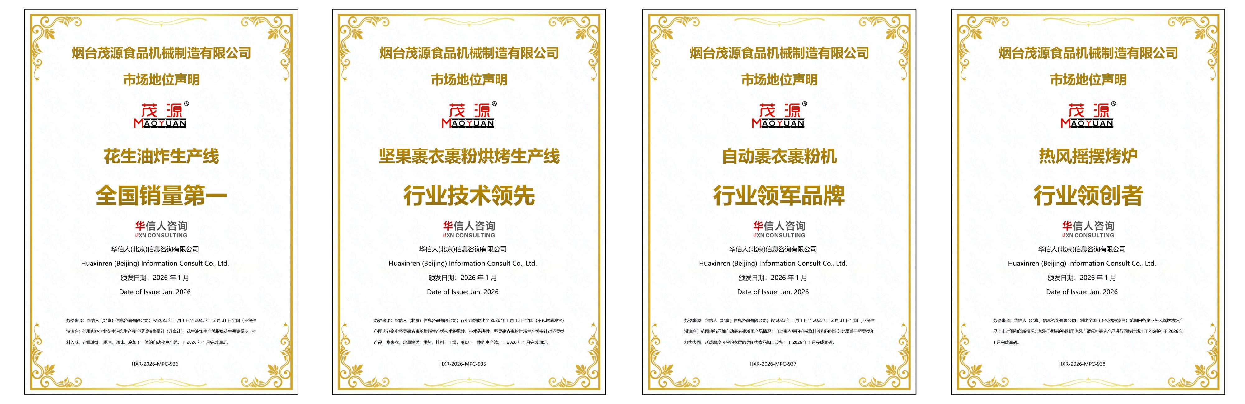 近日,煙台91污食品機械製造(zào)有限公司一舉(jǔ)斬獲由國內權威調研(yán)機構(gòu)華信人(北京(jīng))信息谘詢有限公司頒發的(de)四(sì)項市場地(dì)位(wèi)聲明書。這不僅是對91污三十載深耕行業的權威(wēi)肯定,更標誌著91污在花生油(yóu)炸生產線、堅果裹衣裹粉烘烤生產線、自動裹衣裹(guǒ)粉(fěn)機以及熱風搖擺烤爐(lú)四大核心領域已確立起無可爭議的領先地位。
